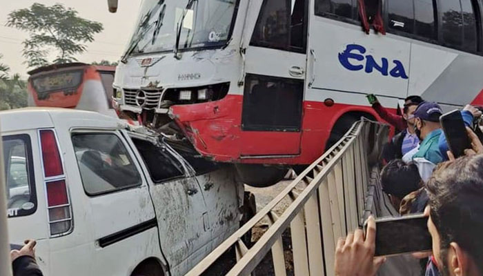 এর আগে সকালে এ বিষয়ে ডিএমপির ট্রাফিক গুলশান বিভাগের বিমানবন্দর জোনের সহকারী পুলিশ কমিশনার (এসি) সাইফুল মালিক বলেন, এনা পরিবহনের একটি বাস মহাখালী বাস টার্মিনাল ছেড়ে সিলেটের উদ্দেশে যাচ্ছিল। আর মাইক্রোবাসটি উত্তরা থেকে আসছিল। হঠাৎ বাসটি একটি গাড়িকে ওভারটেক করতে গিয়ে নিয়ন্ত্রণ হারিয়ে আইল্যান্ড ভেঙে মাইক্রোবাসটিকে ধাক্কা দেয়। এতে বাসটি ও মাইক্রোবাসটি ভেঙে দুমড়ে-মুচড়ে যায়।