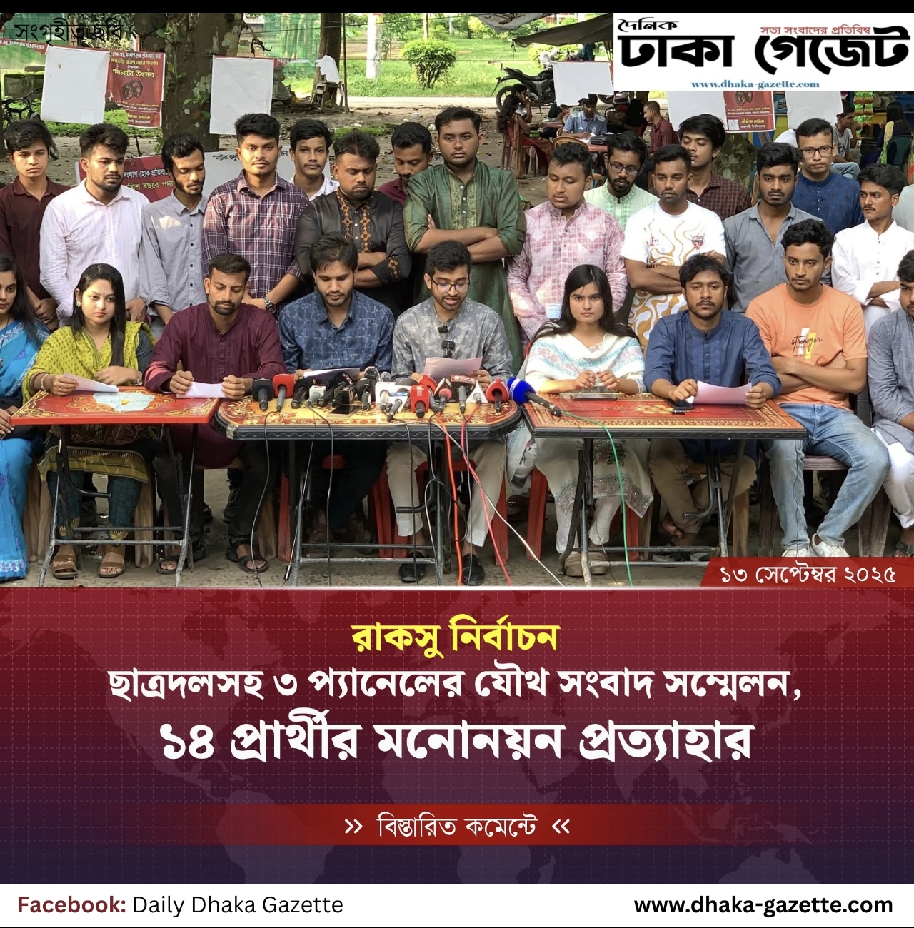 রাকসু নির্বাচন নিয়ে ১২ দফা দাবিতে যৌথ সংবাদ সম্মেলন করেছে ছাত্রদলের প্যানেল, রাকসু ফর রেডিকেল চেঞ্জ প্যানেল, সার্বজনীন শিক্ষার্থী জোট। শনিবার (১৩ সেপ্টেম্বর) বিকেল ৪ টায় ক্যাম্পাসের পরিবহন মার্কেটে এই সংবাদ সম্মেলন হয়।