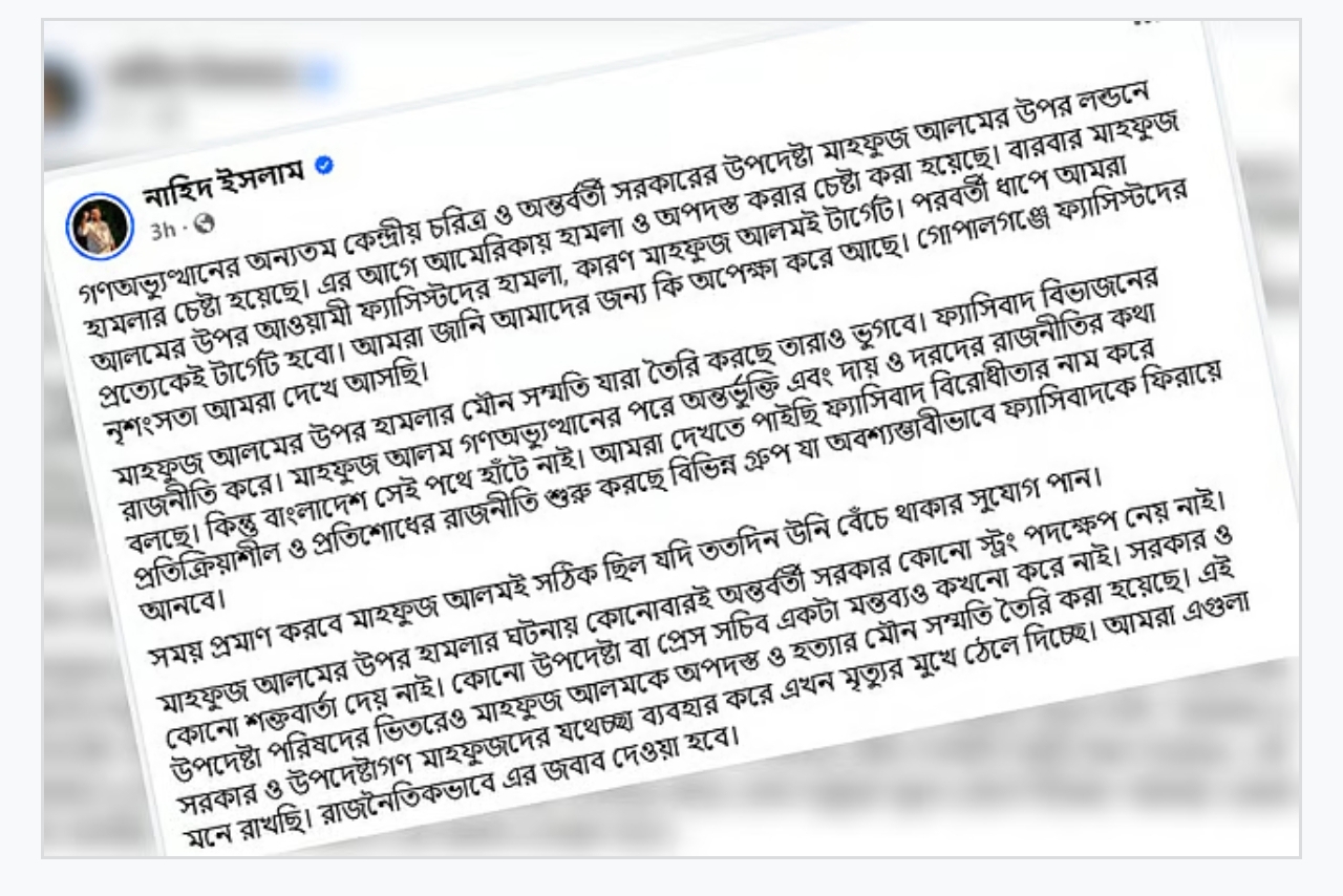 নাহিদ ইসলামের ফেসবুক পোস্ট