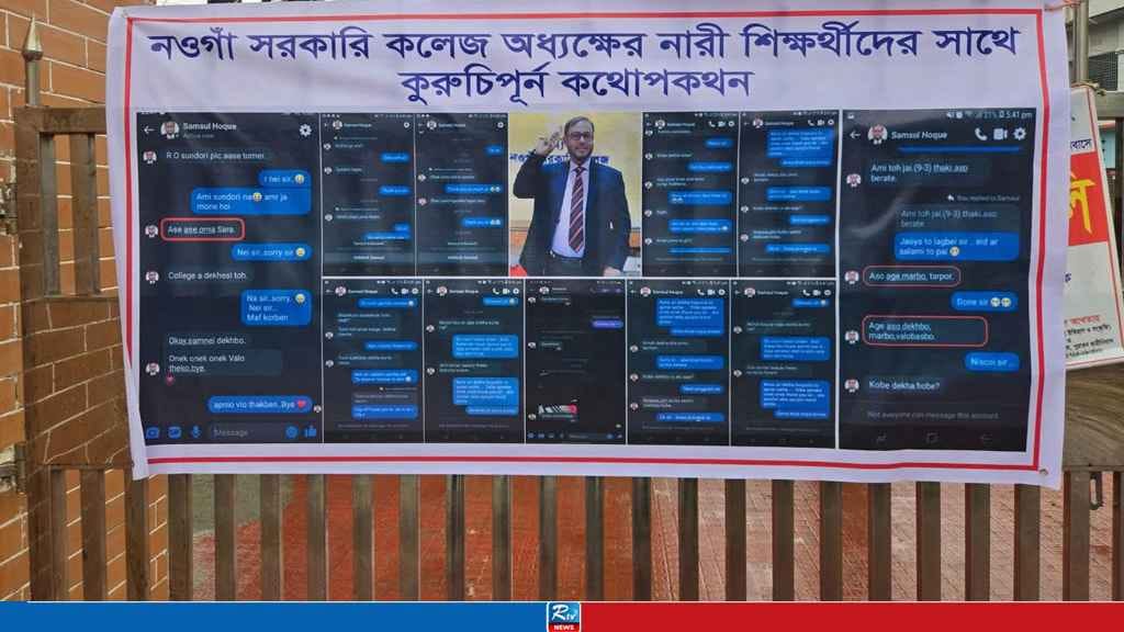 নওগাঁয় কলেজছাত্রীদের আপত্তিকর মেসেজ পাঠানোসহ অবৈধ সম্পর্কে জড়াতে চাপ প্রয়োগের অভিযোগ উঠেছে সরকারি কলেজের অধ্যক্ষ অধ্যাপক সামসুল হকের বিরুদ্ধে। সম্প্রতি এ সংক্রান্ত বিভিন্ন স্ক্রিনশট সামাজিক যোগাযোগমাধ্যমে ছড়িয়ে পড়েছে।